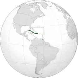Today, the term Spanish Caribbean or Hispanophone Caribbean refers to the Spanish-speaking areas in the Caribbean Sea, chiefly Cuba, the Dominican Republic, Puerto Rico.[3] An even broader definition can include the Caribbean coasts of Mexico, Central America (Guatemala, Honduras, Nicaragua, Costa Rica, & Panama), and South America (Colombia and Venezuela), however aside from Panama, Venezuela, and parts of Colombia, most of these countries share little with the Spanish speaking Caribbean islands culturally.[4] It includes regions where Spanish is the main language, and where the legacy of Spanish settlement and colonization influences culture, through religion, language, cuisine, and so on. The varieties of Spanish that predominate in this region are known collectively as Caribbean Spanish.