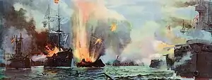 Dewey's squadron made a series of slow firing passes at the Spanish squadron.[14] Still unable to get underway, Castilla had to fight it out at anchor. She had not been repainted, and still sported her peacetime white sides and yellow funnels, making her an easy and attractive target for American gunners. At 0630 hours, Castilla had one 5.9-inch (150 mm) and one 4.7-inch (119 mm) gun disabled by an American shell hit, which also killed several of her crew. American shellfire cut her anchor cables, and she drifted to expose her unprotected side to Dewey's squadron. Three 8-inch (203 mm) hits started a large fire, which by 0715 had begun to destroy her deck, and she was ordered abandoned at 0830;[15] Don Juan de Austria rendered assistance to Castilla under enemy fire.[12]