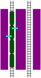 Spanish solution: the principle. Passengers board from the left platform, and alight in the middle island.