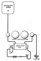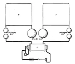 The transmitter works in a rapid repeating cycle in which the capacitor is charged to a high voltage by the transformer and discharged through the coil by a spark across the spark gap.[10][14] The impulsive spark excites the resonant circuit to "ring" like a bell, producing a brief oscillating current which is radiated as electromagnetic waves by the antenna.[10] The transmitter repeats this cycle at a rapid rate, so the spark appeared continuous, and the radio signal sounded like a whine or buzz in a radio receiver.