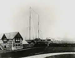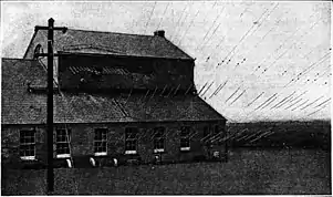 The transmitter was built in secrecy on the coast at Poldhu, Cornwall, UK.[96][49] Marconi was pressed for time because Nikola Tesla was building his own transatlantic radiotelegraphy transmitter on Long Island, New York, in a bid to be first[99] (this was the Wardenclyffe tower, which lost funding and was abandoned unfinished after Marconi's success). Marconi's original round 400-wire transmitting antenna collapsed in a storm 17 September 1901 and he hastily erected a temporary antenna consisting of 50 wires suspended in a fan shape from a cable between two 160 foot poles.[96][98][99] The frequency used is not known precisely, as Marconi did not measure wavelength or frequency, but it was between 166 and 984 kHz, probably around 500 kHz.[97] He received the signal on the coast of St. John's, Newfoundland using an untuned coherer receiver with a 400 ft. wire antenna suspended from a kite.[97][96][99] Marconi announced the first transatlantic radio transmission took place on 12 December 1901, from Poldhu, Cornwall to Signal Hill, Newfoundland, a distance of 2100 miles (3400 km).[97][99]