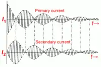 The inductively-coupled transmitter had a more complicated output waveform than the non-syntonic transmitter, due to the interaction of the two resonant circuits. The two magnetically coupled tuned circuits acted as a coupled oscillator, producing beats (see top graphs). The oscillating radio frequency energy was passed rapidly back and forth between the primary and secondary resonant circuits as long as the spark continued.[102][95][103] Each time the energy returned to the primary, some was lost as heat in the spark.[103][95] In addition, unless the coupling was very loose the oscillations caused the transmitter to transmit on two separate frequencies.[95][104] Since the narrow passband of the receiver's resonant circuit could only be tuned to one of these frequencies, the power radiated at the other frequency was wasted.