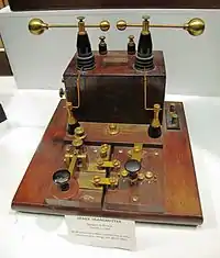 A spark-gap transmitter is an obsolete type of radio transmitter which generates radio waves by means of an electric spark.[1][2] Spark-gap transmitters were the first type of radio transmitter, and were the main type used during the wireless telegraphy or "spark" era, the first three decades of radio, from 1887 to the end of World War I.[3][4] German physicist Heinrich Hertz built the first experimental spark-gap transmitters in 1887, with which he proved the existence of radio waves and studied their properties.