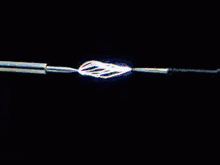 When high voltage is applied to the gap, a spark forms across the bottom of the wires where they are nearest each other, rapidly changing to an electric arc. Air breaks down at about 30 kV/cm,[7] depending on humidity, temperature, etc. Apart from the anode and cathode voltage drops, the arc behaves almost as a short circuit, drawing as much current as the electrical power supply can deliver, and the heavy load dramatically reduces the voltage across the gap.