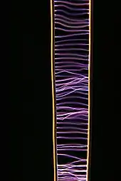 A Jacob's ladder (more formally, a high voltage traveling arc) is a device for producing a continuous train of large sparks that rise upwards. The spark gap is formed by two wires, approximately vertical but gradually diverging from each other towards the top in a narrow V shape. It was named for the "ladder to heaven" described in the Bible.