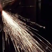 Spark testing is a method of determining the general classification of ferrous materials. It normally entails taking a piece of metal, usually scrap, and applying it to a grinding wheel in order to observe the sparks emitted.[1] These sparks can be compared to a chart or to sparks from a known test sample to determine the classification. Spark testing also can be used to sort ferrous materials, establishing the difference from one another by noting whether the spark is the same or different.