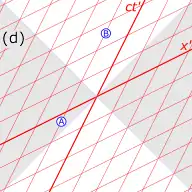 Fig. 31c. Units in the primed axes have a different scale from units in the unprimed axes. From the Lorentz transformations, we observe that coordinates of in the primed coordinate system transform to in the unprimed coordinate system. Likewise, coordinates of in the primed coordinate system transform to in the unprimed system. Draw gridlines parallel with the axis through points as measured in the unprimed frame, where is an integer. Likewise, draw gridlines parallel with the axis through as measured in the unprimed frame. Using the Pythagorean theorem, we observe that the spacing between units equals times the spacing between units, as measured in frame S. This ratio is always greater than 1, and ultimately it approaches infinity as
