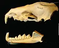The brain is large relative to the body; at 1:67, its brain-to-body mass ratio is higher than that of cats and dogs.[20][21] The cerebral hemispheres of the brain are extensively convoluted.[22] The brain has well-developed olfactory bulbs and its cerebellum is the most ornamented and complex of any member of its subfamily. McDaniel described its corpus callosum and white matter as "exceptionally thick."[22]