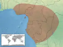 The exact distribution differs between sources, but includes at least Cameroon, Equatorial Guinea, and Gabon,[1][2] and may include the Central African Republic, the Republic of the Congo,[2] and Nigeria.[1]