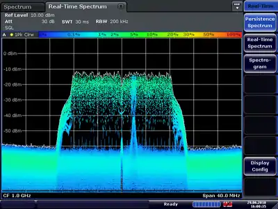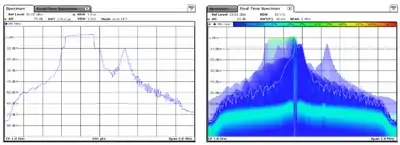 Realtime spectrum analyzers are able to produce much more information for users to examine the frequency spectrum in more detail. A normal swept spectrum analyzer would produce max peak, min peak displays for example but a realtime spectrum analyzer is able to plot all calculated FFT's over a given period of time with the added colour-coding which represents how often a signal appears. For example, this image shows the difference between how a spectrum is displayed in a normal swept spectrum view and using a "Persistence" view on a realtime spectrum analyzer.