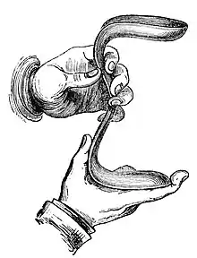 Vaginal and anal specula were used by the ancient Greeks and Romans,[2] and speculum artifacts have been found in Pompeii.[3] A vaginal speculum, developed by J. Marion Sims, consists of a hollow cylinder with a rounded end that is divided into two hinged parts, somewhat like the beak of a duck. This speculum is inserted into the vagina to dilate it for examination of the vagina and cervix.