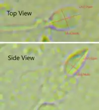 A human sperm cell consists of a flat, disc shaped head 5.1 µm by 3.1 µm and a tail 50 µm long.[2] The tail flagellates, which propels the sperm cell (at about 1–3 mm/minute in humans) by whipping in an elliptical cone.[3] Sperm have an olfactory guidance mechanism, and after reaching the Fallopian tubes, must undergo a period of capacitation before penetration of the ovum.[4]
