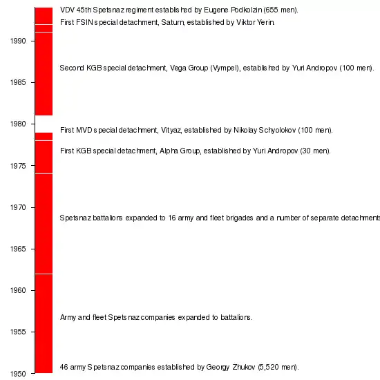 Twenty-four years after the birth of Spetsnaz, the Chairman of the KGB General Yuri Andropov (in that office from 1967 to 1982) established the first counter-terrorist unit. From the late 1970s through to the 1980s, a number of special-purpose units were founded in the KGB (1954–1991) and in the Ministry of Internal Affairs (MVD) (1946–1954).