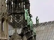 Statues of the Twelve Apostles, made in the style of the 13th century, surrounded the spire at its base. Each of the four sections of the roof had a row of three Apostles, standing one behind the other and staggered by height. In front of each group was another statue of a sign of the Tetramorph symbolizing the Four Evangelists: the bull for St. Luke, the lion for St. Mark, the eagle for St. John and the angel for St. Matthew. Each grouping faced one of the four cardinal directions. All of the statues look out over Paris except for St. Thomas, the patron saint of architects. He was looking towards the spire as if contemplating it. Viollet-le-Duc was the model for the statue of St. Thomas.[8] At the base of the central support beam of the spire, an iron plaque dedicated to the achievement of the workers was inscribed with the image of a compass and a try square. These were the symbols of the mason's guild and a subtle reference to God's role as Great Architect of the Universe in Catholic tradition. Because both Viollet-le-Duc and Bellu are both mentioned by name on the plaque, it has been theorized that they were Freemasons.[9]