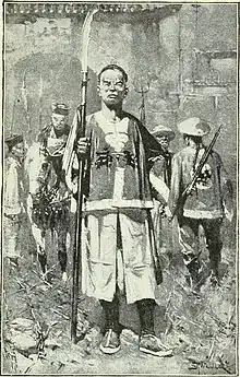 At this point, the Spirit Soldiers numbered over 10,000 fighters,[8] and their forces would continue to grow over the next few years.[32][10] Though the movement would eventually develop a relatively sophisticated organization,[33] it was never really unified. The rebel forces split into three main armies as well as numerous militias early on,[34] and had formed six main branches by 1928.[33] These different groups did not much coordinate their activities.[34] While the Spirit Soldiers generally lacked military training, modern weaponry, and uniforms, they attempted to organize their forces into actual armies. They introduced military ranks, and the rebel fighters identified themselves by wearing a yellow band around their left hand's middle finger since yellow served as "official color" of their movement. In addition, each major Spirit Soldier group dressed in a specific color.[35][32] For example, the Spirit Soldiers in western Hubei mostly wore red turbans and sashs.[9][33] They also carried flags into battle,[33] many of them red,[8] which were inscribed with their leaders' names[33] or slogans that urged for "heavenly"[3] or "universal peace"[2] and the establishment of a "heavenly kingdom" on earth.[3]