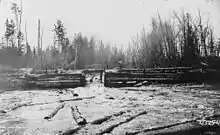 A splash dam was a temporary wooden dam used to raise the water level in streams to float logs downstream to sawmills.[1] By impounding water and allowing it to be released on the log drive's schedule, these dams allowed many more logs to be brought to market than the natural flow of the creek allowed. Water releases from multiple splash dams on tributaries were also often combined to maximize the number of logs floated throughout a given watershed.