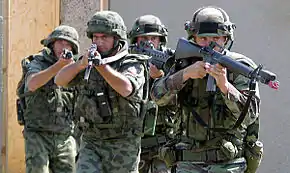 During World War II, Bulgarian paratroopers were equipped with Luftwaffe-Splittermuster 41. Its typical square look with the dashed lines has been the national camouflage of Bulgaria and has continually evolved. It was worn as a one piece boilersuit[7] and as a two piece suit for paratroops, border troops and mountain troops. The mountain version had large patches of reinforcing materials on the knees, elbows, wrists and shoulders and black patches under the arms, around the collar and in the crotch. A Soviet style large beret, pulled down to the left, was worn.[8]