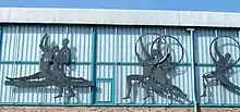 The original building ensemble built from 1955 to 1959 is now a protected building of cultural importance.[6][7][8] The facilities includes artworks such as mosaic artwork by Wolfgang Frankenstein in the foyer of the Dynamo-Sporthalle and the swimming hall, the copper artwork "Sport-Fries" by Wolfgang Frankenstein on the facade of the athletics hall at Konrad-Wolf-Straße and the two bronze sculptures "Seated Swimmer" (German: Sitzende Schwimmerin) by Gustav Weidanz and "Standing Swimmer" (German: Stehende Schwimmerinnen) by Waldemar Grzimek at the outdoor swimming pool.