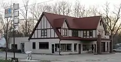 A Tudor revival building constructed in 1931 by William Sprague to house a service station, restaurant and garage, it is the largest of three remaining two-story fuel station buildings on US 66, originally housing a café and service station on the main floor plus two second-floor apartments for the owner and the station attendant.