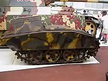 To make the vehicle capable of carrying a bigger payload without the motorcycle-style front fork of the original, two pairs of overlapping and interleaved road wheels were added to the aft end of the running gear on each side; giving three outer and three inner running wheels. It was powered by the same Opel Olympia engine of the Kettenkrad.