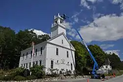 The town approved construction of a meeting house in 1794, but it was not ready for first use until 1797, and was originally located near the town's first burying ground, about 0.5 miles (0.80 km) to the east. It was dedicated in 1799, and was not paid off until after 1801. It underwent major alterations after being moved to its present location in 1851, at which time it was given its present Greek Revival and Gothic features. The upper level space continues to be used in the summer for religious services.[2]