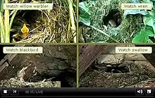 Springwatch, Autumnwatch and Winterwatch, sometimes known collectively as The Watches,[1][2] are annual BBC television series which chart the fortunes of British wildlife during the changing of the seasons in the United Kingdom. The programmes are broadcast live from locations around the country in a primetime evening slot on BBC Two. They require a crew of 100 and over 50 cameras, making them the BBC's largest British outside broadcast events. Many of the cameras are hidden and operated remotely to record natural behaviour, for example, of birds in their nests and badgers outside their sett.