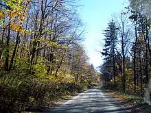 As with almost the entirety of the MNF, most of the original Spruce Mountain upland forest was completely denuded by logging around the turn of the 20th century and now consists of second- or third-growth forest. (The only documented exception to this on the Mountain is the 17-acre (69,000 m2) North Spruce Mountain Old Growth Site.[6] ) The present second-growth forest of Spruce Mountain is characterized by a dominance of sugar maple (Acer saccharum), American beech (Fagus grandifolia), and yellow birch (Betula lutea). Other characteristic species of the mixed mesophytic forest region are also present: tuliptree (Liriodendron tulipifera), basswood (Tilia heterophylla, T.floridana, T. neglecta), chestnut (Castanea dentata), yellow buckeye (Aesculus flava), red oak (Quercus borealis), white oak (Q. alba), and eastern hemlock (Tsuga canadensis). The upper reaches of Spruce Mountain also include areas termed northern hardwood and northern evergreen forest types. The former is typified by red oak, white ash (Fraxinus americana), basswood (Tilia spp.), red maple (Acer rubrum), and cherry (Prunus spp.). The latter is dominated by the Mountain's eponymous red spruce (Picea rubens).[7] While not extending above the timberline, the stunted tree growth high on this windy mountaintop is relatively open.