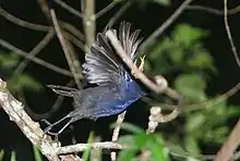 This is a small whistling thrush, at only 20 cm. Adult males are dark blue with a darker head and back. There are bright blue patches on the shoulders, supercilia and forehead. The female is brown above and chestnut below, but has a bright blue shoulder patch like the male.