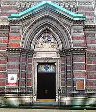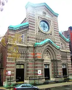 The brick church designed by Renwick has an "usually intricate facade, with colorful bands of red brick, celadon glazed bricks and polychrome terra cotta,"[3] creating "an evocative and delicate facade."[7] Sculpted reliefs on the depict Christ, the Holy Family and two angels.[3] The overall design compares favorably to Renwick's All Saints Church on East 129th Street,[4] and may have been inspired by Renwick's travels in Italy before joining his uncle's firm.[7]