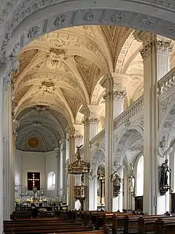 In the late 17th and early 18th centuries, the church was an important center of musical culture in Düsseldorf. The composer Johann Hugo von Wilderer served as its organist. The mausoleum, designed by Venetian architect Simone del Sarto, contains the tombs of several Electors Palatine, including that of Johann Wilhelm.[5] The high altar of the church was destroyed during World War II. The new altar, designed by Ewald Mataré was built in 1960. Paintings by Ernst Deger can be found in the church's two side altars which are dedicated to the Virgin Mary.[6]