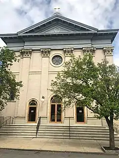 The church building was built 1911. The Italianate church was dedicated by Cardinal John M. Farley in November 1911.[1] When opened, it accommodated 700.[1][2] A temporary school was opened in 1911, with 200 students, staffed by seven Sisters of Charity nuns.[1] Opposite the church, a convent for the Sisters of Charity was opened in January 1913 at a cost of $8,000 (which in 1914 still had a debt of $5,500).[1] In 1914, the parish numbered around 1,000, and the property was valued at $100,000, with a debt of $59,500.[1] The chapel and high school building were erected during the pastorship of Msgr. George McWeeney (1947-1965).[3] During the 1980s, up to 22 masses were celebrated in the parish each week.[3] The rectory, parish center and high school chapel were renovated during the pastorate of Msgr. Timothy S. Collins (1986-1994).[3]