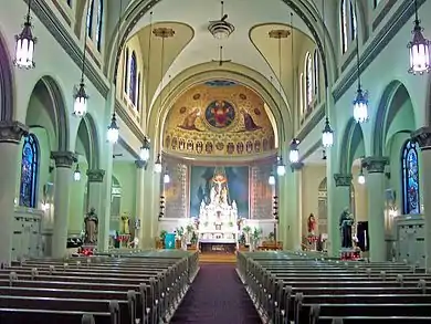 The church was designed by the architecture firm of Worthmann and Steinbach in the Polish Cathedral architectural style. It has Romanesque architecture with Italianate chandeliers. With the arcades running along both sides of the nave and the large arch framing the main altar, the church is remiminiscence of St. Paul's Within the Walls in Rome.