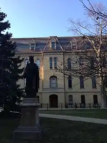 Matthew J. Walsh decided to build Saint Edward's Hall in 1882 to house the boarding school for the minims program, ages six to thirteen, which was growing and reached a population of a 100 in 1883. The hall was designed by Charles Harding, C.S.C, in Notre Dame yellow brick in French style, with a Mansard roof and named after Edward Sorin's patron saint.[4] The cornerstone was laid on 20 April 1882 by Sorin himself. It had dormitories, classrooms, recreation rooms, refectory, and a manicured lawn in front of the building. An annex was built on the east side of the hall in 1898 to make room for a gym, a roller skating rink, and more classrooms. In 1925, Knute Rockne received his First Holy Communion in the Chapel of Saint Edward the Confessor.[5] In 1929 president Charles L. O’Connell decided to abandon the boarding school program, and the hall was converted into an undergraduate residence hall (since the college population was growing and space badly needed) under the direction of professor and architect Vincent Fagan in June 1929.[6] The open dormitory was converted into double rooms, while the chapel was left untouched, and it opened in Septepmber to house 207 undergraduates.[7] The hall's first rector was Raymond Clancy, C.S.C.[8] The building annex was demolished to make space for Zahm Hall in 1937. The facade received minor renovations in 1976. Disaster struck on 25 June 1980 when a fire broke out resulting in extensive damage. In the summer of 1980, the third and fourth floors of the building caught fire and were heavily damaged but have since been rebuilt. Saint Edward's Hall's signature annual event is Founder's Day and Founder's Week. It is celebrated during the week of October 13 and it includes a 3-on-3 basketball tournament, historical lectures, talent show, and a special dormitory Mass. There is also an annual Spring excursion to Chicago, the Yacht Dance, in which the Gentlemen take part in a dance aboard a chartered yacht. St. Ed's main dorm rivalry is with Sorin Hall.