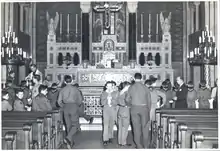 In 1968, as a result of liturgical changes made by the Second Vatican Council, the church hired the architects Robert Venturi and John Rauch to renovate the altar space to create a free standing altar.[6] The alterations that Venturi and Rauch added included five parts: a new altar, a celebrant's chair, a suspended cathode light and the elevation of the sanctuary floor.[7] These renovations were in an entirely modern style, clashing with the Byzantine architecture of the interior. The renovations were removed almost immediately at the request of the parishioners, who reacted negatively to the renovations.[8]