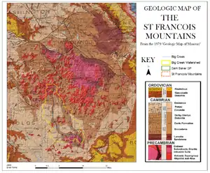 The St. Francois Mountains in southeast Missouri are a mountain range of Precambrian igneous mountains rising over the Ozark Plateau. This range is one of the oldest exposures of igneous rock in North America. The name of the range is spelled out as Saint Francois Mountains in official GNIS sources,[1] but it is sometimes misspelled in use as St. Francis Mountains to match the anglicized pronunciation of both the range and St. Francois County.[2][3][4]