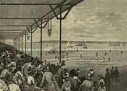 The stadium, which was built along the lines of a typical horse race track grandstand, was first used as a baseball field in 1853, with the first game between the New York Knickerbockers and the Washington Club.[2] The site later became part of the development of the then-new community of St. George, Staten Island in 1886, by Erastus Wiman. Fans were able to watch games while watching the construction of the Statue of Liberty. Although the community and the ferry were successful, baseball was not. The Giants were a strong team through the latter part of the 1880s, and the Metropolitans folded after the 1887 season. The Giants played some games there from April 29 – June 14, 1889, while awaiting construction of the Polo Grounds; their move to Manhattan ended professional baseball at St. George.