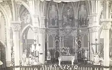 The church is a Gothic Revival structure, built in the shape of a Latin cross.[3]:225 Its exterior consists of brick walls and a gabled roof, upheld by a stone foundation. The most prominent aspect of its exterior is a massive belfry and clock tower,[2] approximately 200 feet (60 m) tall.[3]:226 Large rose windows illuminate the interior,[2] which features painted and frescoed walls; the distance from the floor to the apex of the ceiling vault is 62 feet (19 m).[3]:226 A major renovation project in the 1970s led to significant changes in the sanctuary, including the removal of statues and its High Gothic altar.[2]