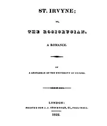 St. Irvyne; or, The Rosicrucian: A Romance is a Gothic horror novel written by Percy Bysshe Shelley in 1810 and published by John Joseph Stockdale in December of that year, dated 1811, in London anonymously as "by a Gentleman of the University of Oxford" while the author was an undergraduate.[1][2] The main character is Wolfstein, a solitary wanderer, who encounters Ginotti, an alchemist of the Rosicrucian or Rose Cross Order who seeks to impart the secret of immortality. The book was reprinted in 1822 by Stockdale and in 1840 in The Romancist and the Novelist's Library: The Best Works of the Best Authors, Vol. III, edited by William Hazlitt. The novella was a follow-up to Shelley's first prose work, Zastrozzi, published earlier in 1810. St. Irvyne was republished in 1986 by Oxford University Press as part of the World's Classics series along with Zastrozzi and in 2002 by Broadview Press.