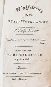 The novel was popular enough, however, to be made into two chapbooks in 1822 and 1850. The first chapbook version was entitled Wolfstein; or, The Mysterious Bandit and was published and printed by John Bailey at 116, Chancery Lane in London in 1822 after the original novel was republished that year.[6][8][9][10] The chapbook version was a condensed version of the novella in 28 pages meant for popular consumption, serving the same function as a paperback would. The chapbook sold for sixpence.