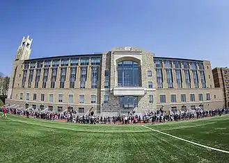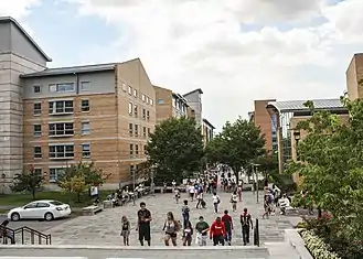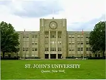 St. John's University is a private, Catholic university in New York City. The school was founded in 1870 by the Congregation of the Mission (C.M., the Vincentian Fathers) with a mission to provide a growing immigrant population with quality higher education.[3] Originally located in the Brooklyn borough of New York City, the flagship campus was moved to its current location in the Queens borough during the 1950s.[4] St. John's has additional New York City campuses in Staten Island and Manhattan, as well as the Long Island Graduate Center in Hauppauge, New York.[5] Additionally, the university has international campuses located in Rome, Italy, Paris, France,[6] and Limerick, Ireland.[7] The university is under the patronage of Saint John the Baptist.[4]