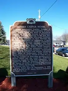 Immigrants from Prussia began settling in the Holyland region of Wisconsin in the 1830s. They began holding religious services in settler's huts with services conducted by Father Theodore Van den Broek.[2] Members donated 2 acres of land for a permanent site and a small log church was built over the middle of 1843.[3] Father Pete Carabin was appointed the first permanent pastor but he did not take residence.[3] The Archdiocese of Milwaukee was formed in 1843; the church has remained in the archdiocese since.[4] Newly appointed Bishop John Henni, a Swiss native, visited the church and parishioners were excited to be addressed using their native German language.[4] An 1844 census of the church showed 40 registered families.[3] The Bishop named Father Caspar Rehrl the first resident pastor in September 1845.[5] All land within 8 miles (13 km) from Lake Winnebago had been purchased by settlers or was owned by Native Americans and parishioners built a church on the large hill in Mount Calvary which is now the home of the St. Lawrence Seminary High School.[6] Father Fabian Bermadinger arrived from Austria (along with three Brothers) to assist Rehrl in 1847.[7]