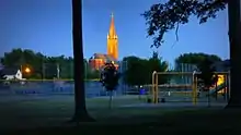The current St. John's Church was completed in 1888 at a cost of $40,145. Its architecture, which has been ranked among the leading churches of Mercer County,[3]:224 features a massive tower that was designed to house four tower clocks. Large amounts of sandstone are used to trim the corners of the brick church, which can be entered through three doors at the base of the tower. The church is built on a stone foundation and is topped with a gabled roof of asphalt. Many rounded lancet windows of stained glass illuminate the interior; among the most prominent of its windows are those of the sacristy, which feature deep blue stained glass. The church's heavily decorated interior includes elaborate altars and a reredos built in the Romanesque Revival style.[4]