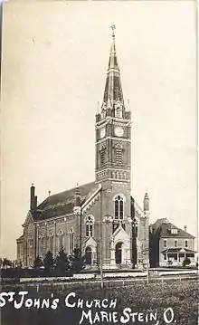 St. John the Baptist Catholic Church is a historic Roman Catholic church in Marion Township, Mercer County, Ohio, United States. Located in the unincorporated community of Maria Stein, it is the home of an active congregation and has been recognized as a historic site because of its well-preserved late nineteenth-century Romanesque Revival architecture.