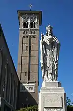The most outstanding feature of the church is the Campanile, or bell tower. Set well back from the facade and contiguous with the outside wall of the church, it stands free and does not compromise the facade. The Byzantine design of the top of the tower is reminiscent of the churches of the Ravenna region of Italy. An unusual feature of that style was to set the tower towards the rear of the building rather than the front. The bells ring on each quarter-hour and toll the hour, ringing the Westminster Chimes. The front approach has a broad flight of stone stairs extending the entire width of the building. The lower portion of the facade was treated as an arcade of five arches, supported by marble columns with Ionic capitals. Above the five arches a broad frieze, a band of terra cotta trim crowns the arcade. Above the frieze is a rose window, an exact replica of a church window in Toscanella, Italy. This "Wheel of fortune" represents unending life and imitates the sun. On the very peak of the facade was a statue of John the Evangelist.