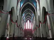 Windows are fitted with tall stained glass and have pointed arches.[6] The cathedral's stained glass windows were produced in France before being transported to Vietnam.[18] The ceiling is rib vaulted like those seen in medieval Europe. The nave is weathered and the sanctuary looks shiny and is made of gilt trimmed wood, similar to that of Phat Diem Cathedral and has royal Hue architectural embellishments. A statue of Virgin Mary is kept in palanquin according to the local custom, which is seen to the left of the nave. It is at the end of the church street which is an upscale market area with boutiques and silks.[6]