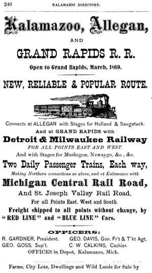 In 1855 the company completed a line along the St. Joseph River from Constantine to Three Rivers, a distance of 7.5 miles (12.1 km), well short of the act's target. The company had difficulty moving forward, but the legislature obligingly extended the deadline in 1861 and again in 1863. On November 21, 1864, the St. Joseph Valley leased the 3.9-mile (6.3 km) section of the Michigan Southern & Northern Indiana which connected White Pigeon to Constantine, giving the St. Joseph Valley an uninterrupted running length of some 11.4 miles (18.3 km) but still well short of Cassopolis, let alone Berrien County. In 1865 a new act by the Michigan State Legislature authorized the Schoolcraft & Three Rivers to purchase the St. Joseph Valley Railroad, but this did not take place until August 14, 1869, at which point the St. Joseph Valley ceased to exist as an independent company.[2] In the meantime the St. Joseph Valley operated over the Schoolcraft & Three Rivers tracks into Kalamazoo, where it connected with numerous other lines.[3]