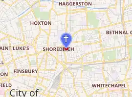 St. Leonard's, Shoreditch is the ancient parish church of Shoreditch, often known simply as Shoreditch Church. It is located at the intersection of Shoreditch High Street with Hackney Road, within the London Borough of Hackney in East London. The current building dates from about 1740. The church is mentioned in the line "When I grow rich, say the bells of Shoreditch" from the nursery rhyme Oranges and Lemons.[1]