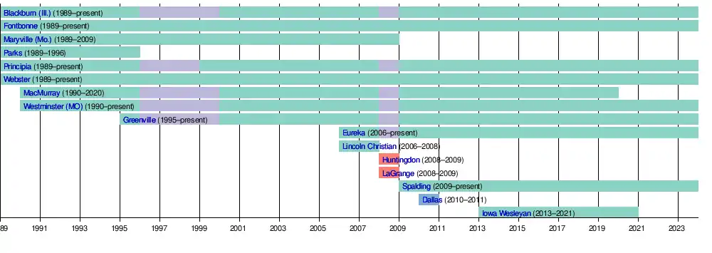 - September 1989: The SLIAC chartered with Blackburn, Fontbonne, Maryville, Parks, Principia and Webster the original members.