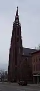 The historic Gothic Revival third church is located at 35 Edward Street. The church is laid out in a Latin-cross floor plan and features a 245 ft octagonal Medina sandstone steeple with a Seth Thomas clock. Above the steeple rests a 72 ft pierced spire; reputed to be the tallest open-work spire ever built completely of stone (without reinforcement) in USA.[1]
