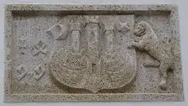 Coat of arms of the Triune Kingdom of Croatia, Slavonia, and Dalmatia (left), and the city of Zagreb (right).[3]